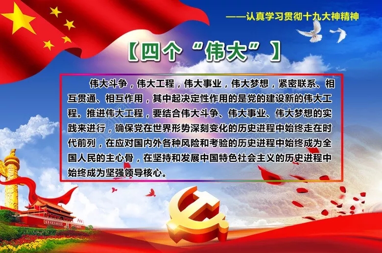 黨的十九大修改黨章明確把統(tǒng)攬“四個偉大”寫了進來,“四個偉大”指的是進行偉大斗爭、建設(shè)偉大工程、推進偉大事業(yè)、實現(xiàn)偉大夢想。