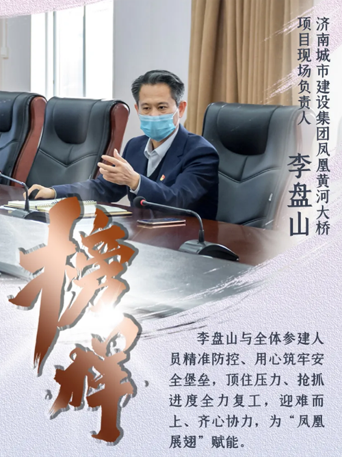 陽春三月,兩岸新綠。鳳凰黃河大橋施工現(xiàn)場,各施工區(qū)域熱火朝天、作業(yè)正忙。自項目全面復工以來,1000多名工人日夜奮戰(zhàn)一線,在做好疫情防控工作基礎上,項目建設各項工作全速推進。作為濟南城市建設集團鳳凰黃河大橋項目現(xiàn)場負責人,李盤山與全體參建人員精準防控、用心筑牢安全堡壘,頂住壓力、搶抓進度全力復工,迎難而上、齊心協(xié)力,為“鳳凰展翅”賦能。