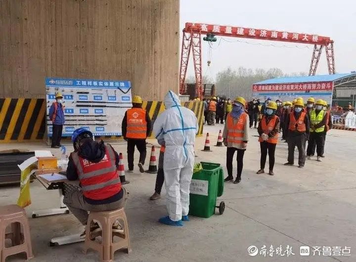從場區(qū)外圍可以看到,濟南黃河大橋擴建項目部有著一套完備的現(xiàn)場疫情防控體系。出入口有工作人員值守,對進場人員進行詳細詢問、登記。